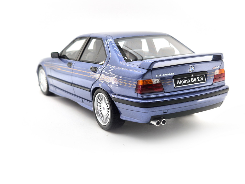 Az Otto Models 1:18-as méretarányú modellje kiválóan adja vissza az eredeti Alpina karakterét. A nem nyitható, resin kivitel lehetővé teszi a rendkívül pontos karosszériaformákat, az Alpina-specifikus lökhárítókat, a jellegzetes többküllős felniket és a finom részleteket. A fényezés egységes, mély hatású, míg a belső tér kialakítása arányaiban és részleteiben is hű az eredetihez.