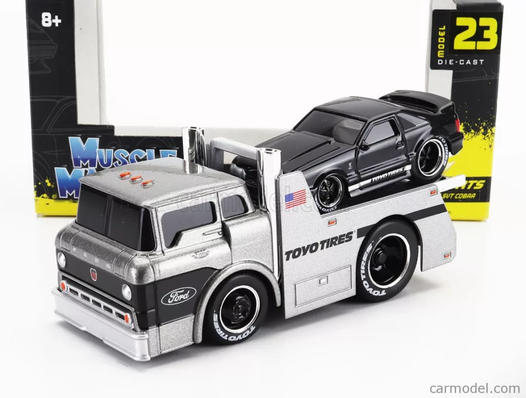 FORD USA C600 FLATBED TRUCK CAR TRANSPORTER WITH MUSTANG SVT COBRA COUPE TOYO TIRES CUSTOM 1993 SILVER BLACK