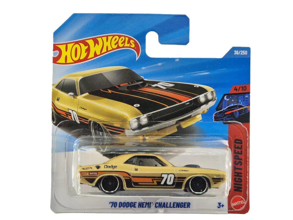 A Hot Wheels ’70 Dodge Hemi Challenger – Night Speed 4/10 (36/250) a klasszikus amerikai izomautók egyik legismertebb darabját hozza el 1:64-es méretarányban. A karakteres Challenger forma és a legendás HEMI örökség erőt sugárzó megjelenést biztosít. A Night Speed sorozat a modern, sötét hangulatú utcai stílust emeli ki, ezért különösen népszerű a gyűjtők körében. Bliszteres kivitelben érkezik, ideális választás Hot Wheels- és muscle car rajongóknak.
