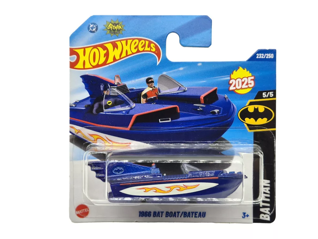 A ’66-os Bat Boat a klasszikus Batman TV-sorozat legendás járműve, amelyet a híres George Barris-féle design ihletett. A Hot Wheels miniatűr változata hűen hozza a kor jellegzetes stílusát és a kultikus vízi jármű formáját. Igazi különlegesség DC- és Batman-rajongóknak, valamint azoknak, akik szeretik a retró filmtörténelem ikonikus járműveit.