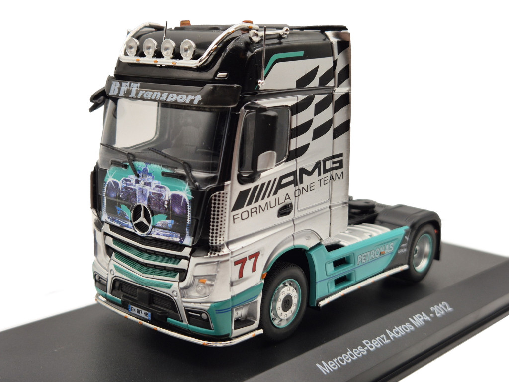 A valódi Mercedes-Benz Actros MP4 a hosszú távú szállítás etalonja, amely kiváló aerodinamikával, modern vezetéstámogató rendszerekkel és kimagasló komforttal rendelkezik. A hatékonyság és megbízhatóság kulcsfontosságú egy Forma–1-es csapat esetében, ahol minden perc és minden kilométer számít. Az AMG Petronas csapat jellegzetes ezüst–türkiz festése mára a motorsport egyik legismertebb arculatává vált, amely a kamionokon is ugyanolyan látványosan jelenik meg, mint a versenyautókon.