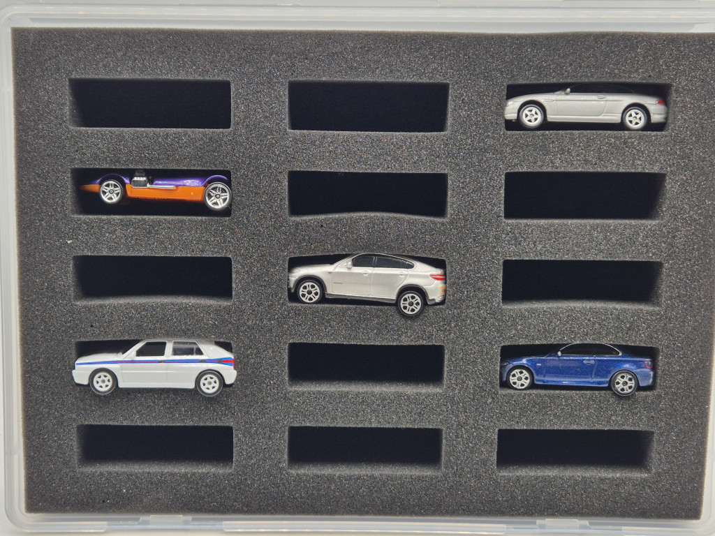 A doboz 15 férőhelyes kialakítással és több rétegű szivacsozással védi a Hot Wheels, Matchbox és más 1:64-es kisautókat a karcolódástól és sérüléstől. A masszív külső és a puha belső betét hosszú távon is megőrzi a modellek állapotát, legyen szó prémium, Treasure Hunt vagy ritka darabokról. Kiváló választás tároláshoz, kiállításhoz vagy szállításhoz – minden gyűjtő számára praktikus és biztonságos megoldás.