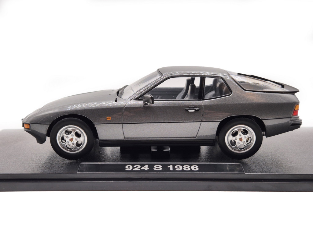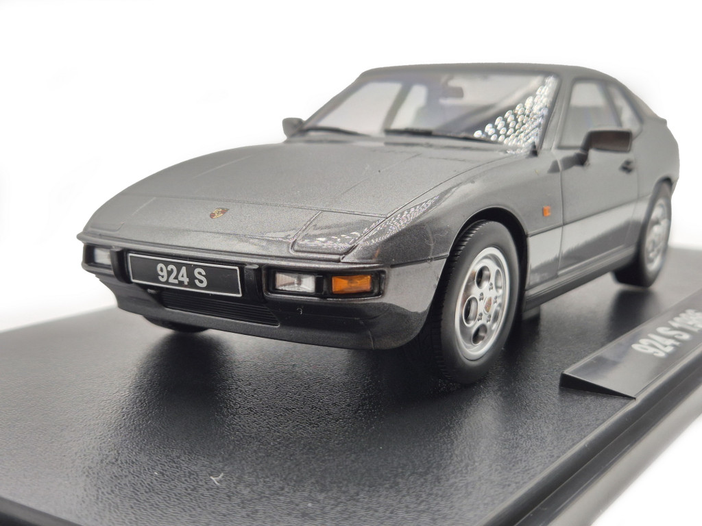 A Porsche 924S (1986) a ’80-as évek egyik meghatározó sportkupéja, amely a Porsche letisztult formavilágát és könnyű, élményorientált vezethetőségét testesíti meg. A metál szürke fényezés különösen elegánssá teszi a modell megjelenését, kiemelve a hosszú motorháztetőt, az áramvonalas karosszériát és a 924-es széria ikonikus vonalvezetését. A valóságban a 924S a Porsche és a VW közös fejlesztésének kiforrott, erősebb változata, amely a 944-es modell motorját és technikai fejlesztéseit kapta – a kompakt kupé így vált igazán sportossá.
