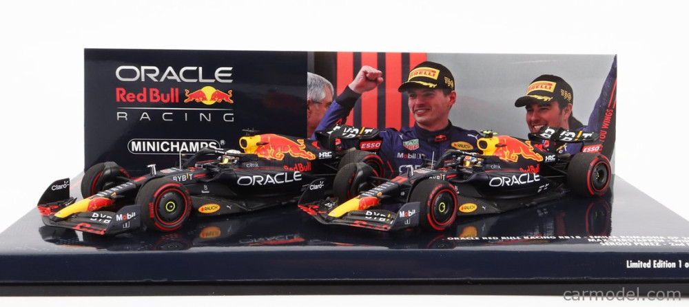 RED BULL  F1  SET 2X RB18 TEAM ORACLE RED BULL RACING N 1 WINNER EMILIA ROMAGNA ITALY GP WORLD CHAMPION 2022 MAX VERSTAPPEN + N 11 2nd EMILIA ROMAGNA ITALY GP 2022 SERGIO PEREZ
