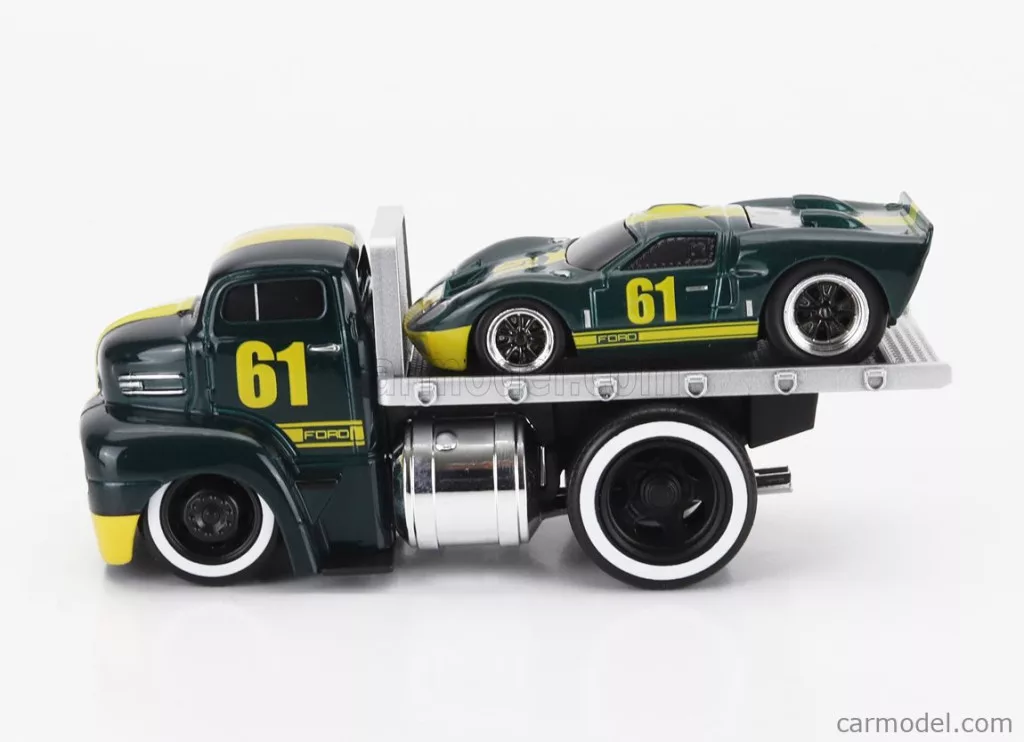 FORD USA COE FLATBED TRUCK CAR TRANSPORTER 1965 WITH GT40 N 61 CUSTOM 1966 GREEN MET YELLOW