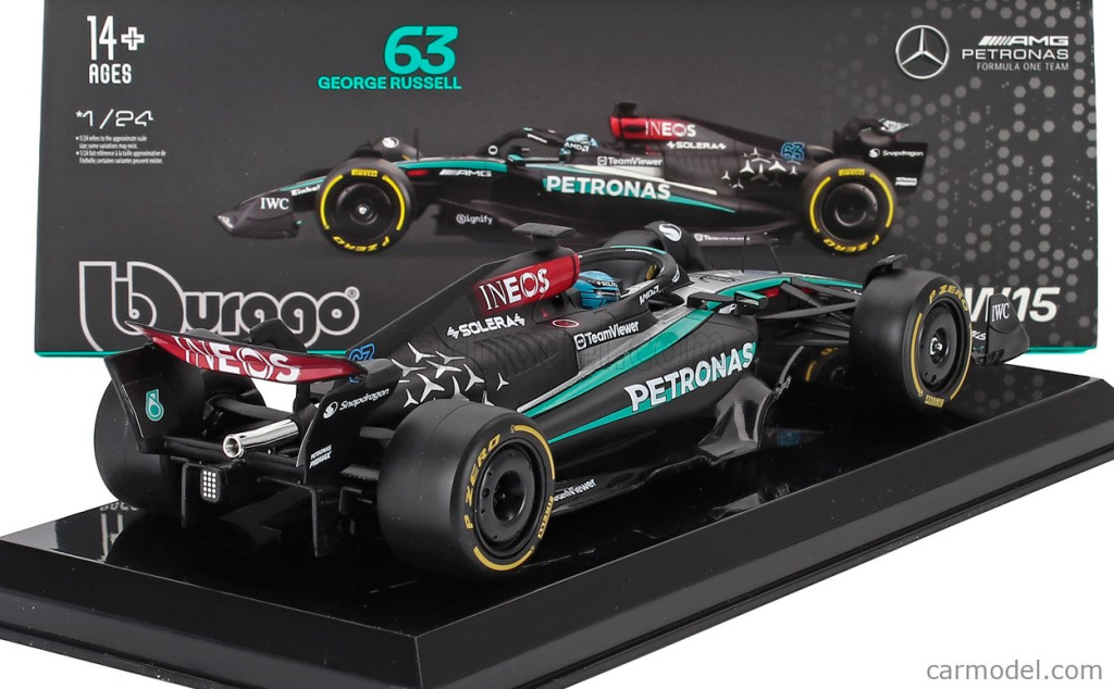 MERCEDES GP  F1  W15 EQ PERFORMANCE TEAM AMG PETRONAS MOTORSPORT N 63 SEASON 2024 GEORGE RUSSELL - WITH PILOT AND SHOWCASE  BLACK SILVER GREEN