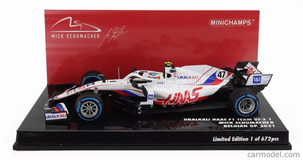 HAAS F1 VF-21 FERRARI 065/6 TEAM URALKALI N 47 BELGIUM GP 2021 MICK SCHUMACHER WHITE BLUE RED